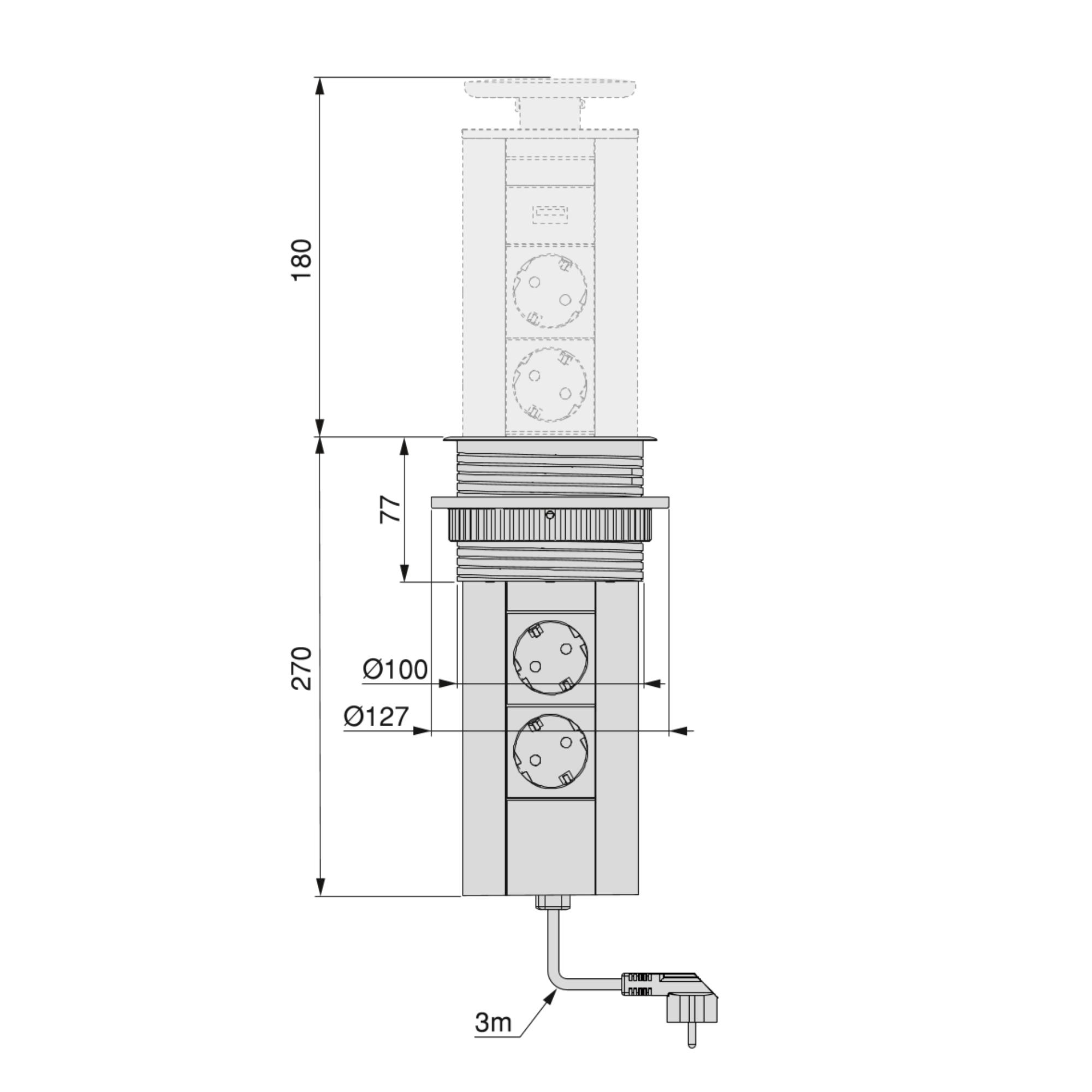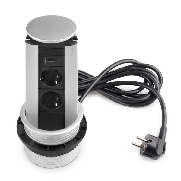 Torre multitomada para encastrar. Com segurança infantil integrada, 2 tomadas tipo F schuko (EU) de potência máxima até 3600W-16A e uma entrada USB tipo-A.