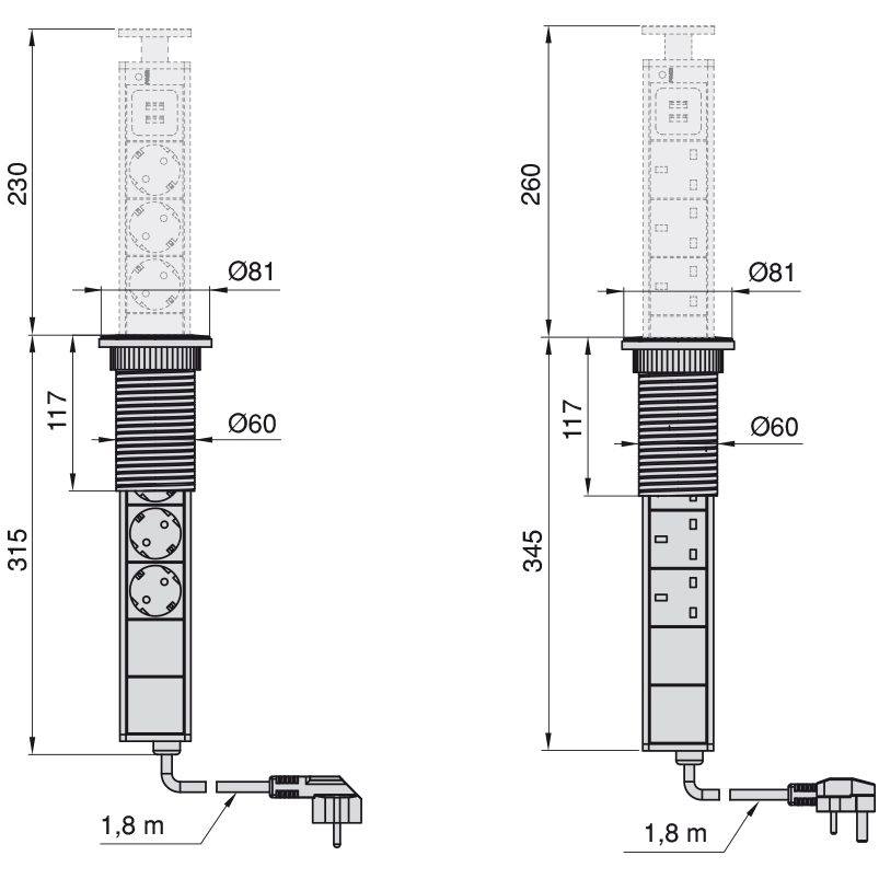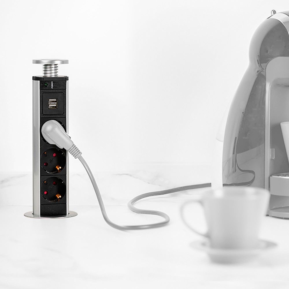 Tomada Vertikal com USB inclui: 3 tomadas do tipo Schuko, 2 tomadas USB, LED sinalizador on/off.